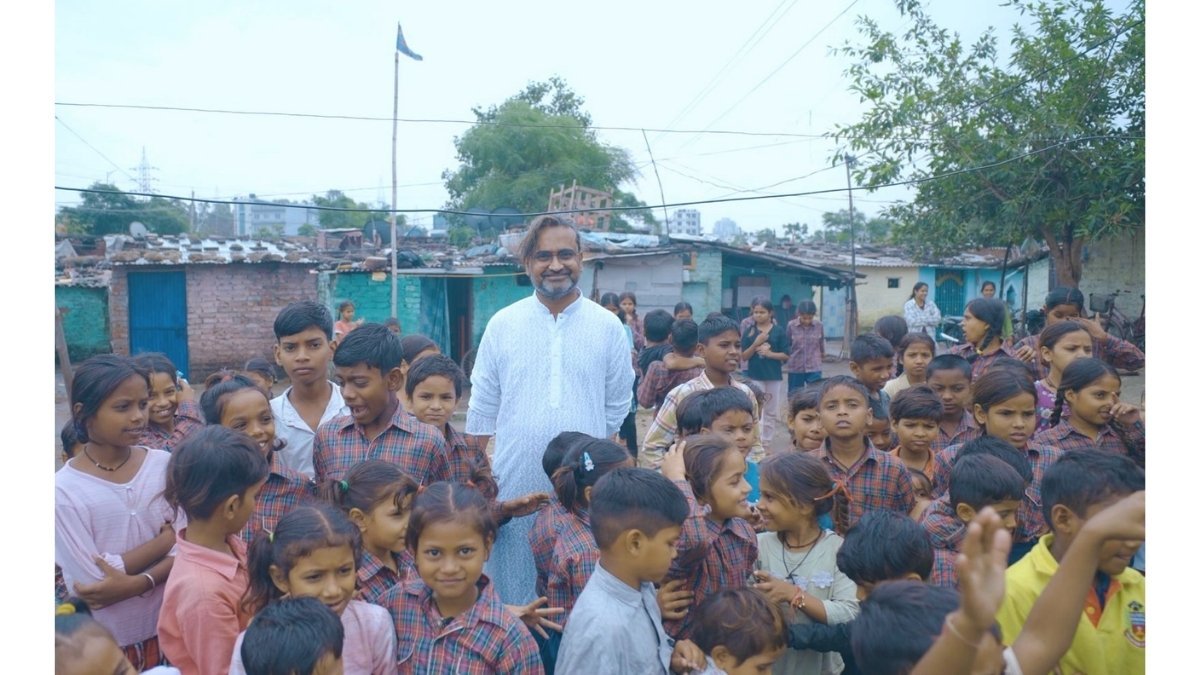 The photograph tells a story before a word is read. Shekhar Natarajan — Forbes-listed, patent-holder, the man who grew Walmart’s grocery business 166-fold from $30 million to $5 billion — stands in the middle of a sea of uniformed schoolchildren in Hyderabad, wearing a white kurta, radiating calm. The children press in from every side. He is grinning.