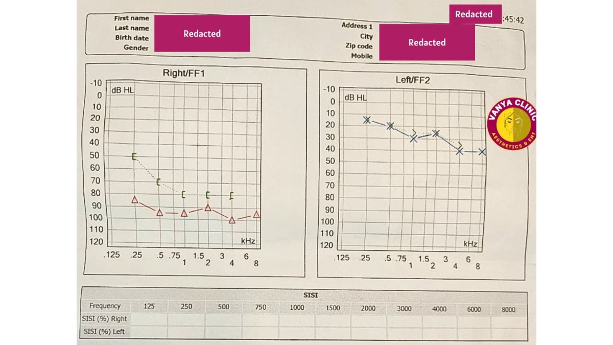 The approach focused on preserving residual hearing and improving nerve function through targeted medical therapy, including Endoscopic Intratympanic Injection Treatment. Dr. Purodha Prasad done careful monitoring and stepwise management were followed to ensure maximum recovery potential and prevent further deterioration of hearing.Below is the actual report of audiometry done for the patient.